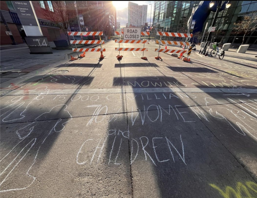Our vision of an art vigil materialized under the feet of those who chanted, sang and rallied for a ceasefire that day. It grounded the action, almost literally, in the humanity that calls us to speak out in this moment.